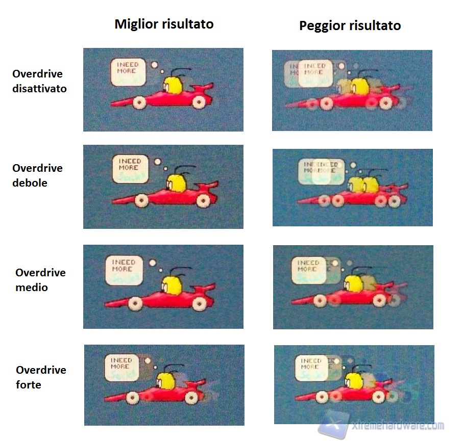 Il comportamento migliore si è verificato con l’impostazione settata al livello Medio. Diminuendo l’intensità del contributo dell’overdrive, si riesce lievemente a percepire un tempo di risposta leggermente inferiore; comportamento questo evidenziato nella media dei risultati ottenuti. Portando la funzione sul valore Forte, si incorre nel classico “fantasma scuro”, meglio noto con il nome di reverse ghost, causato da un’eccessiva azione dell’overdrive.