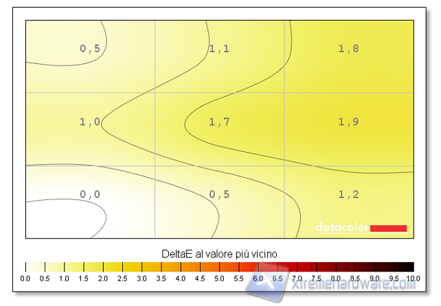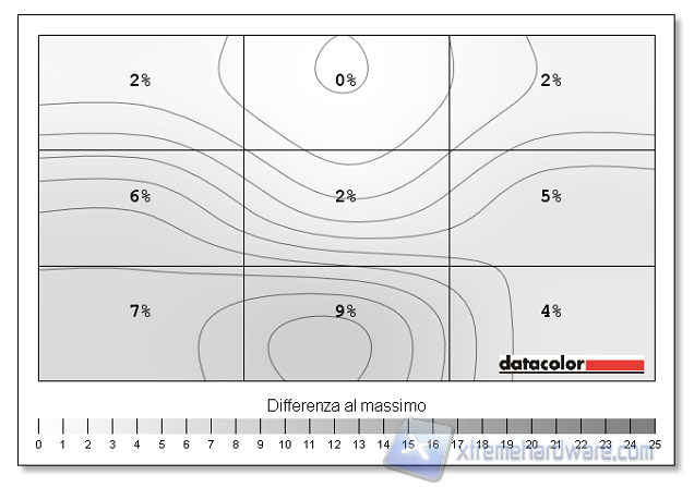 Suddividendo lo schermo in nove rettangoli, abbiamo misurato con il colorimetro l’uniformità della luminosità e dei colori. La differenza massima registrata è risultata pari al 9%, con una media del 4,1%, per quanto riguarda la luminosità, mentre per il colore, il Delta-E maggiore è stato di 1,9, con una media di 1,1.